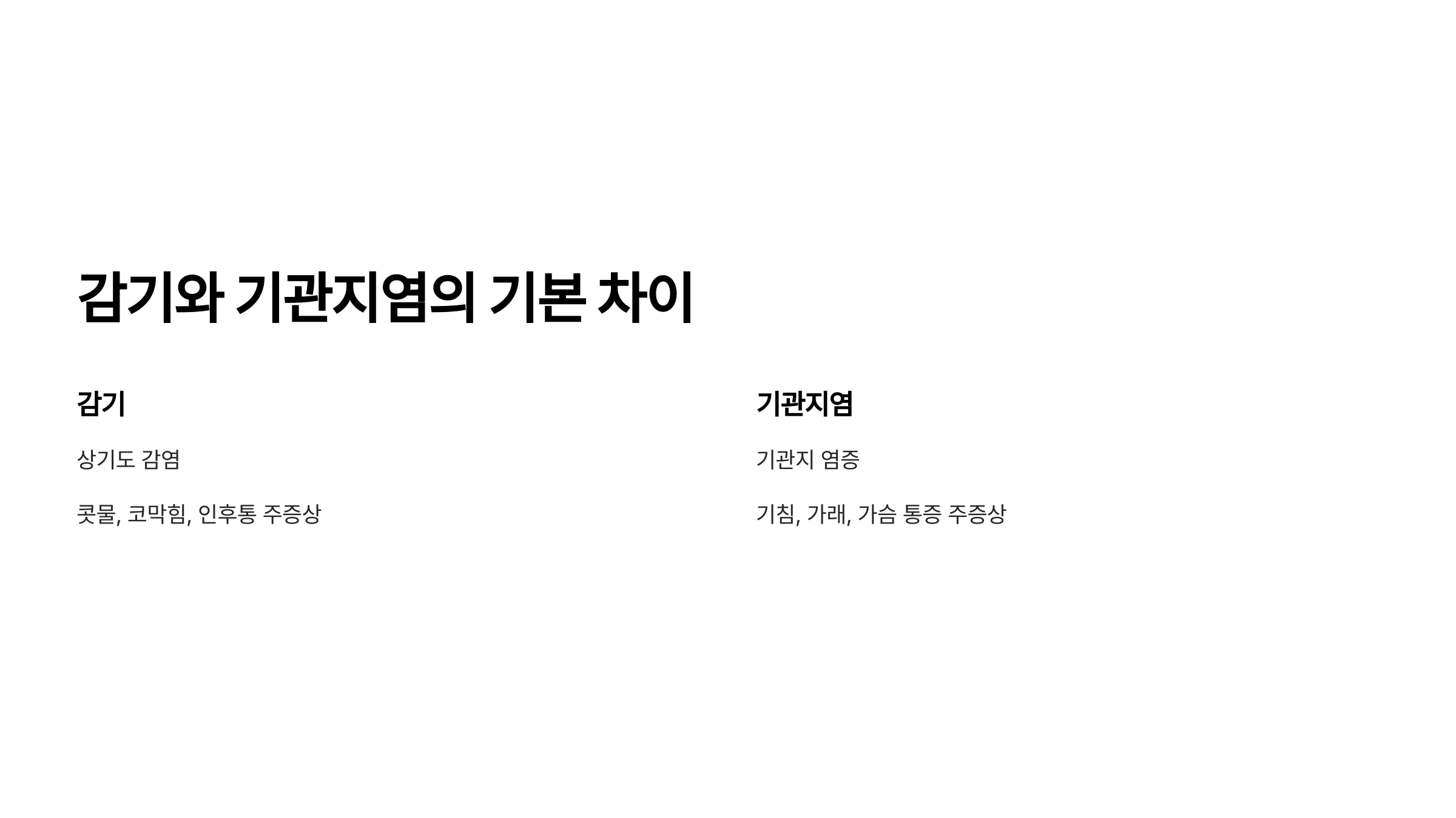 감기는 비교적 가볍고 전신 증상도 약한 편이에요. 콧물 나고, 코가 막히고, 목이 따끔거리는 정도죠. 반면 기관지염은 기침이 중심입니다. 특히 가래가 섞인 기침이 지속되고, 가슴이 답답하거나 숨을 쉬기 힘들 수 있어요. 저도 감기라고 생각했던 기침이 2주 넘게 계속돼 병원에 갔더니 기관지염이었어요. 천명 소리(쌕쌕거림)도 나타났고요.