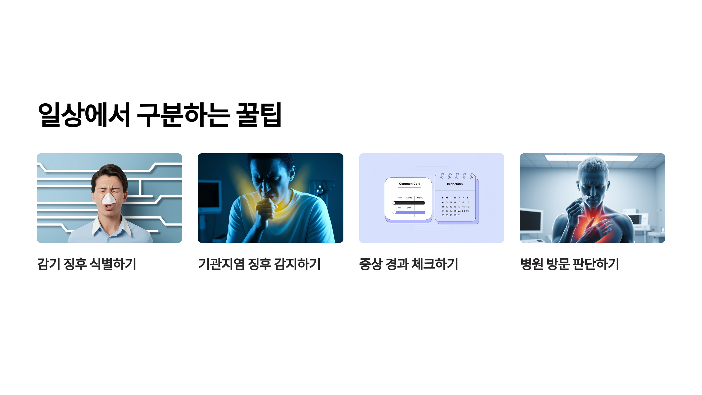 생활 속에서 감기와 기관지염을 구분하는 팁은 이렇습니다. 콧물, 재채기, 미열, 목 통증 중심이면 감기일 가능성이 높고요, 기침이 오래가고 가래가 많으며 가슴까지 불편하다면 기관지염을 의심해야 해요. 또 감기는 며칠 안에 정점을 찍고 서서히 나아지지만, 기관지염은 오히려 시간이 지날수록 심해지는 경우도 많아요. 이런 점에서 경과를 지켜보는 것도 중요한 판단 기준이 돼요.