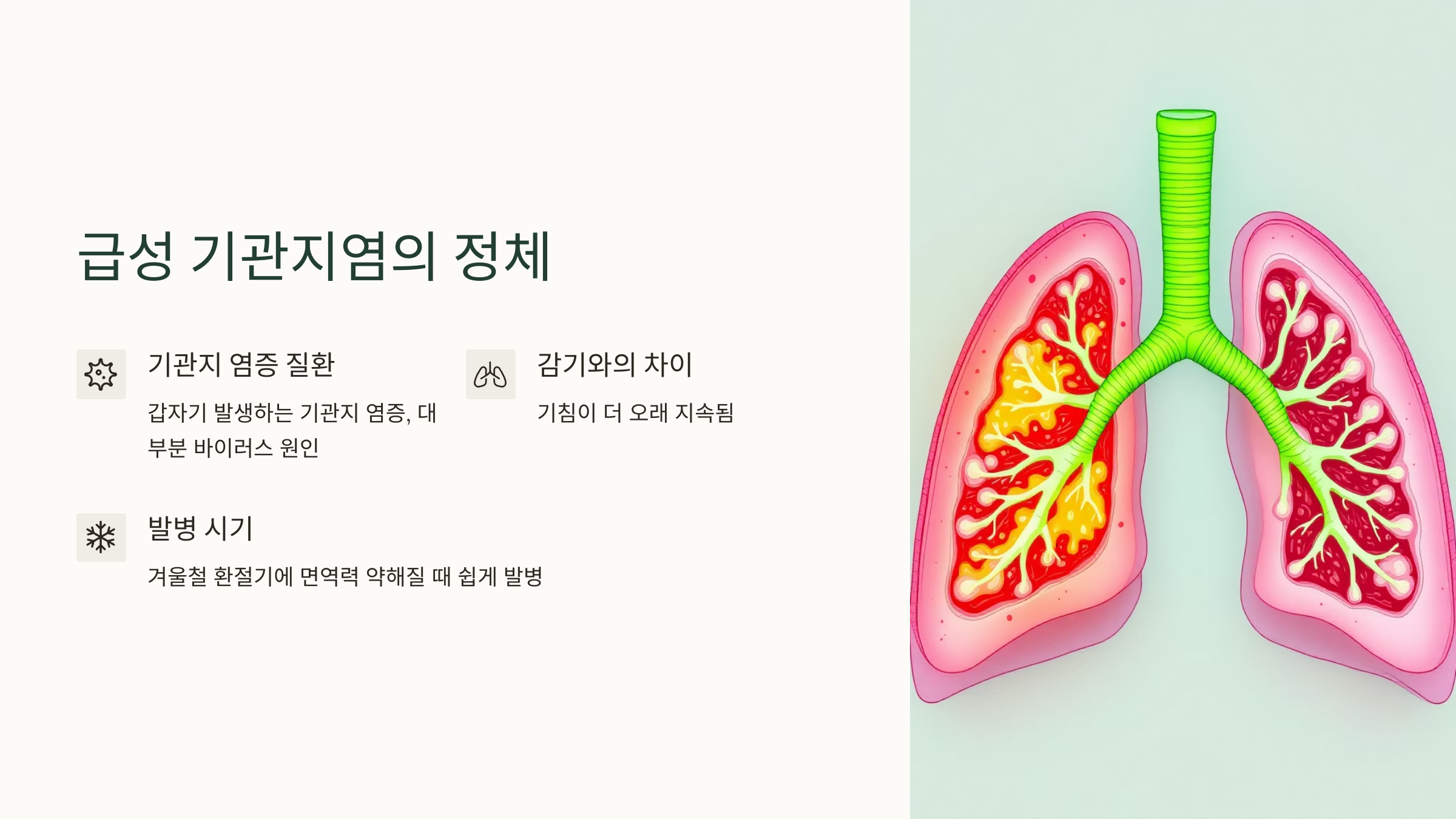 급성 기관지염은 갑자기 발생하는 기관지의 염증 질환으로, 대부분 감기 후에 이어지는 경우가 많아요. 바이러스가 주원인이며, 세균성인 경우도 있지만 드물어요. 일단 시작되면 기침이 멈추질 않아 일상생활이 너무 불편해지죠. 특히 겨울철 환절기엔 면역력이 약해지기 쉬워 누구나 쉽게 걸릴 수 있어요.