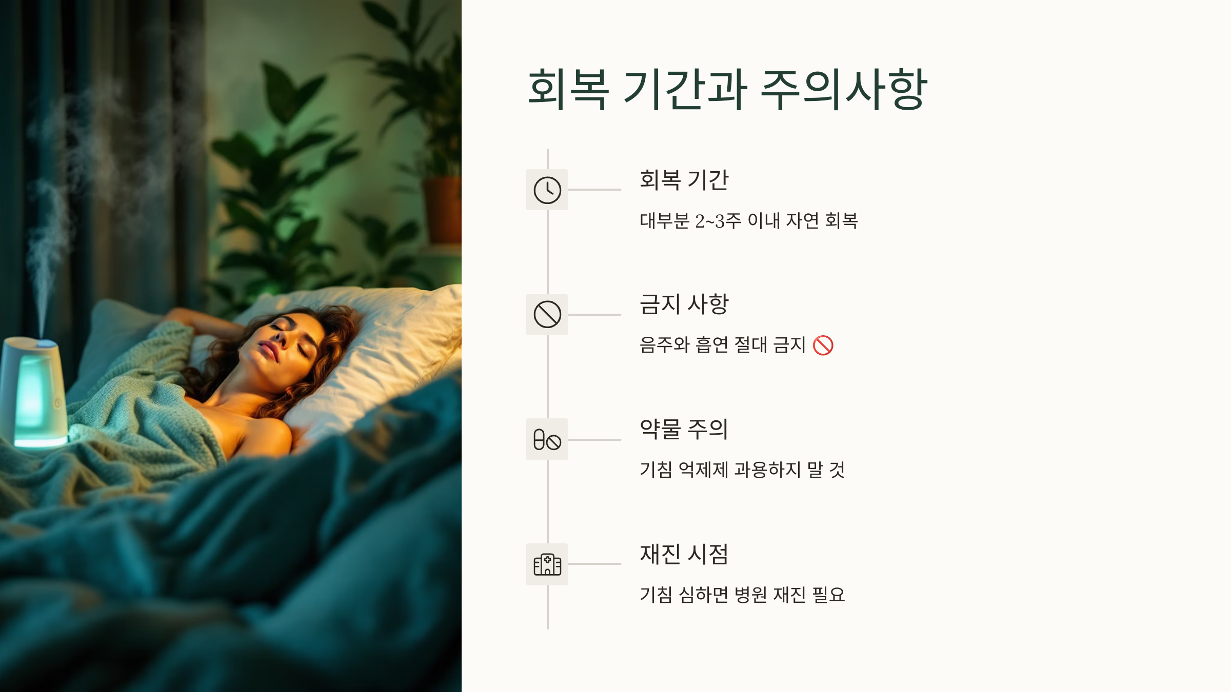 급성 기관지염은 대부분 2~3주 이내 자연 회복돼요. 하지만 기침이 계속되거나 몸 상태가 나빠지면 폐렴 등 합병증으로 이어질 수 있어요. 회복 기간 동안 다음과 같은 점에 주의해주세요: