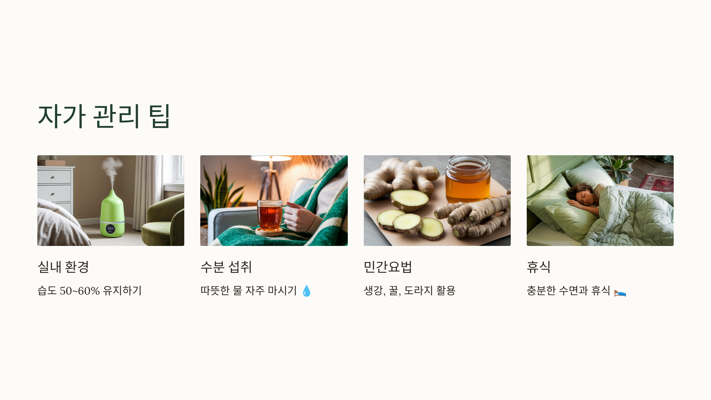 이렇게 자가 관리를 잘 하면 회복 속도가 빨라지고 재발도 예방할 수 있어요. 특히 목 보호를 위해 외출 시 마스크 착용은 꼭 해주세요!