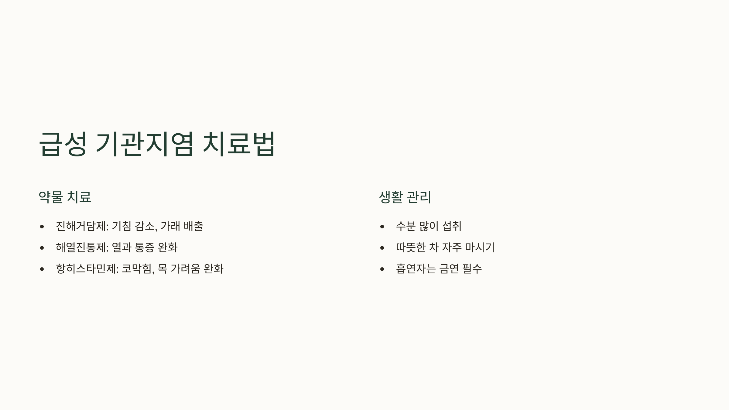 급성 기관지염의 치료는 대부분 증상 완화 중심이에요. 항생제는 세균성인 경우에만 사용하며, 대부분의 경우 바이러스성이라 필요 없어요. 그래서 주로 다음과 같은 약이 처방돼요: