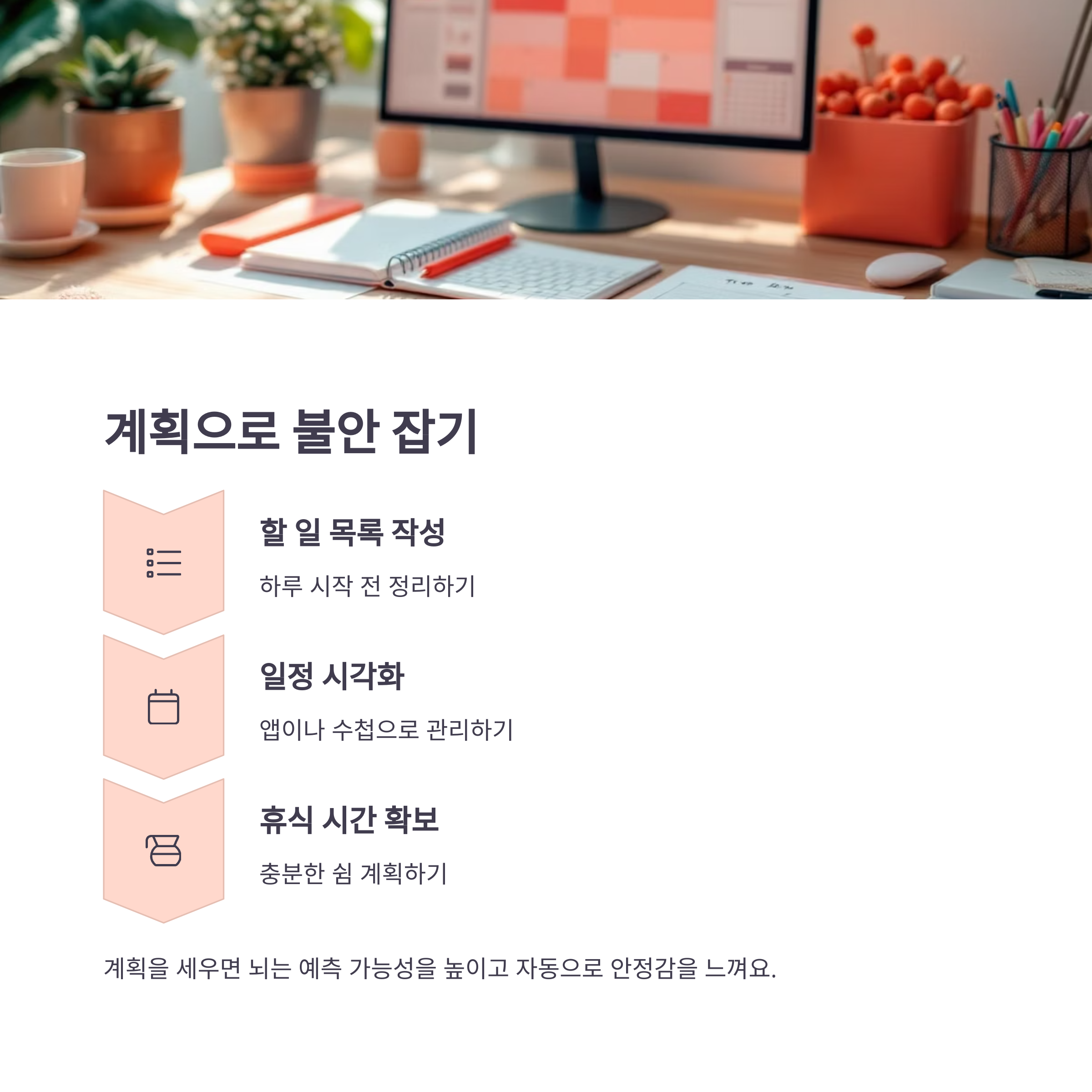 ‘해야 할 일이 산더미’처럼 느껴질 때, 실제로는 계획이 없기 때문인 경우가 대부분입니다. 계획을 세우면 뇌는 예측 가능성을 높이고, 자동으로 안정감을 느끼게 됩니다.