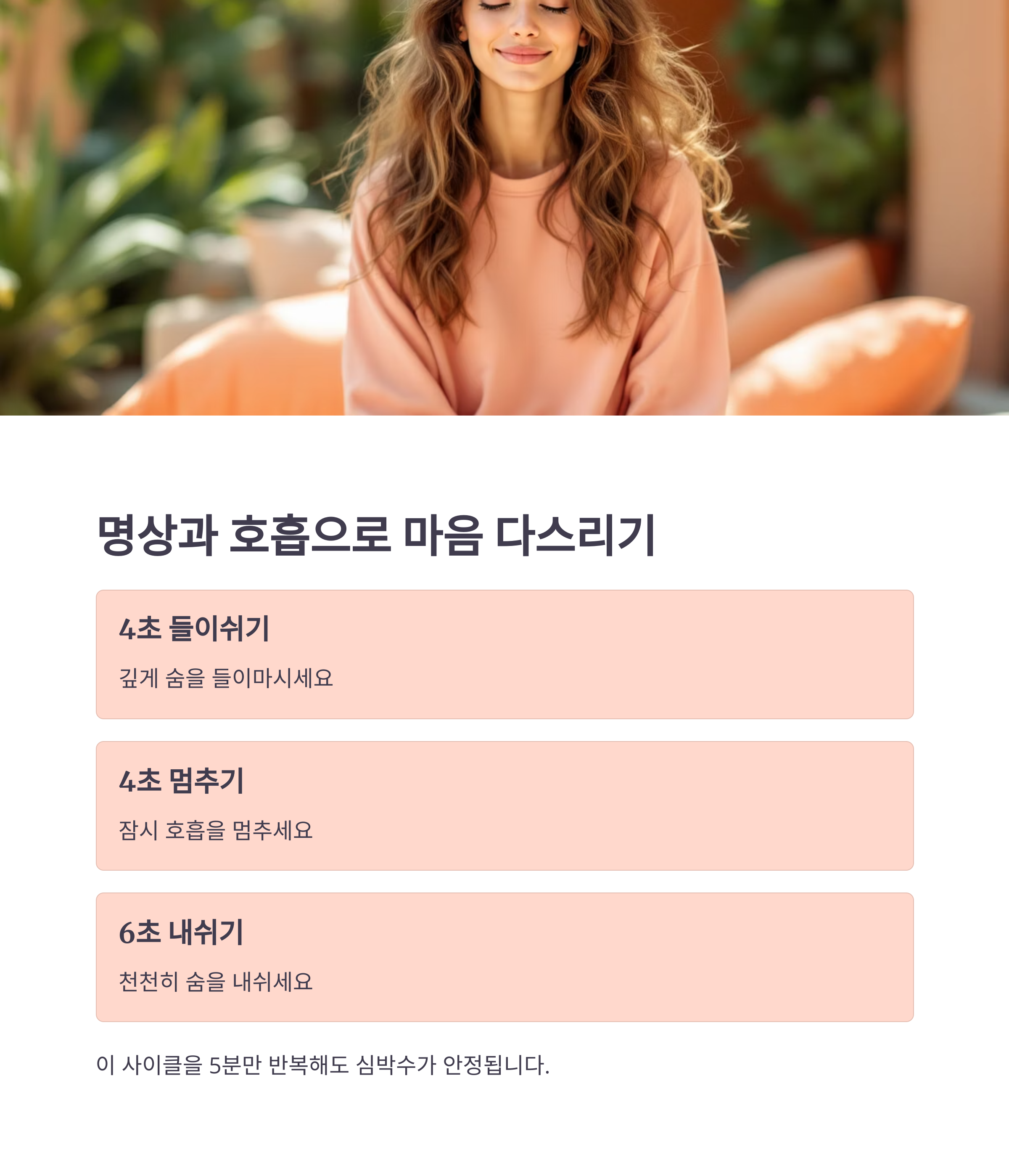 오늘 소개한 ① 명상·호흡, ② 운동, ③ 대화, ④ 계획 수립을 실천에 옮겨보세요.