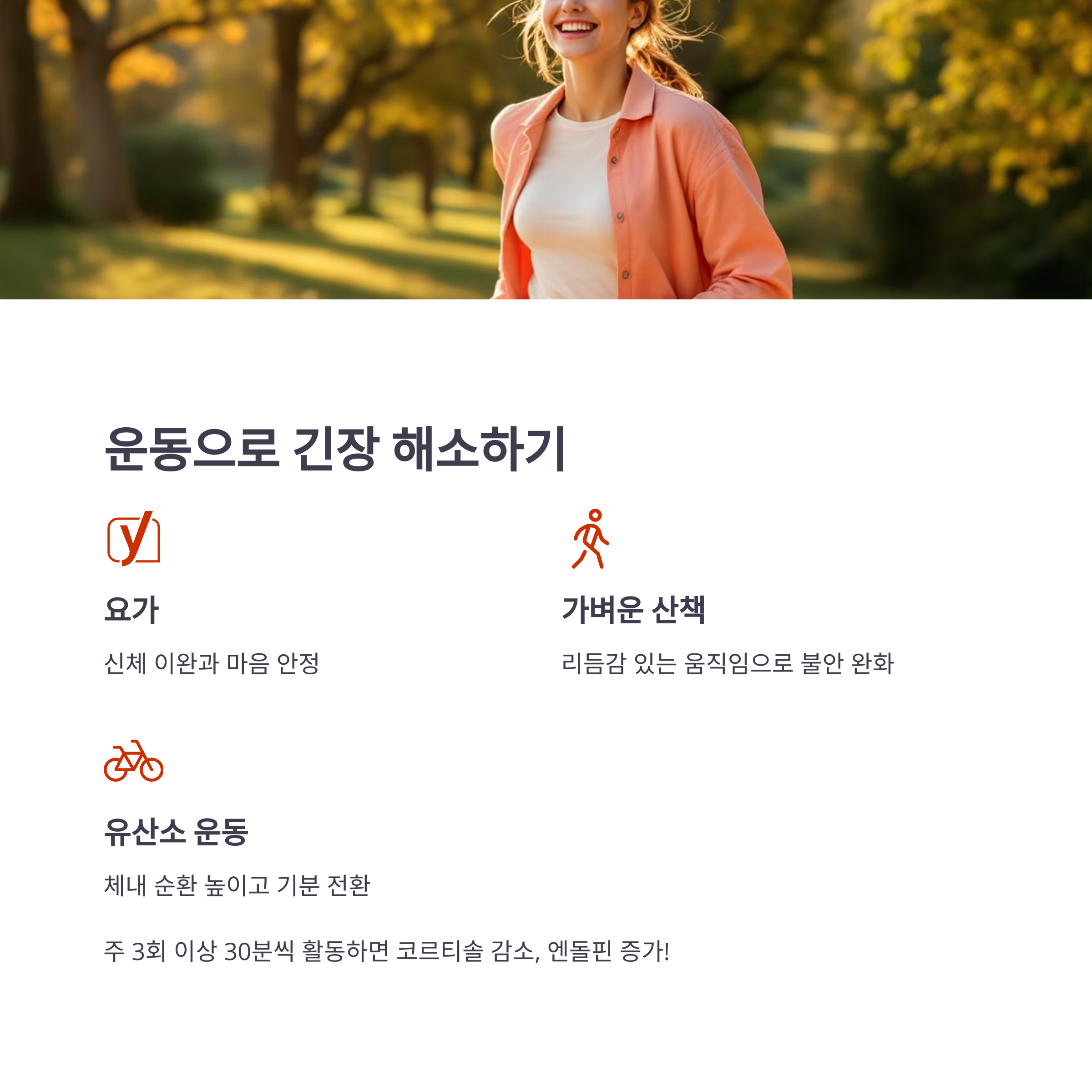 운동 후 땀이 나면서 느끼는 해방감은 긴장의 부정적인 감정을 중화시키는 데 큰 역할을 합니다. 주 3회 이상 30분씩 활동해보세요.