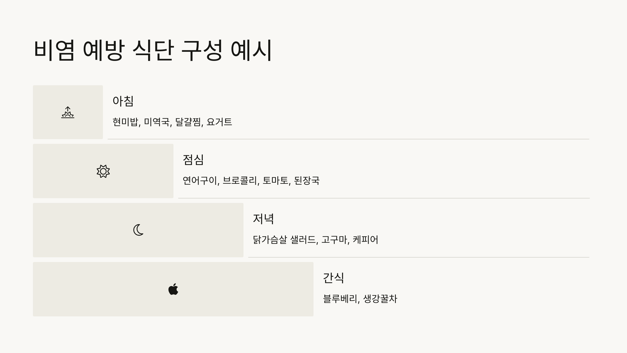 다음은 하루 식단 예시예요. 무리 없이 실천 가능하면서도 면역력 강화에 도움 되는 조합이죠.