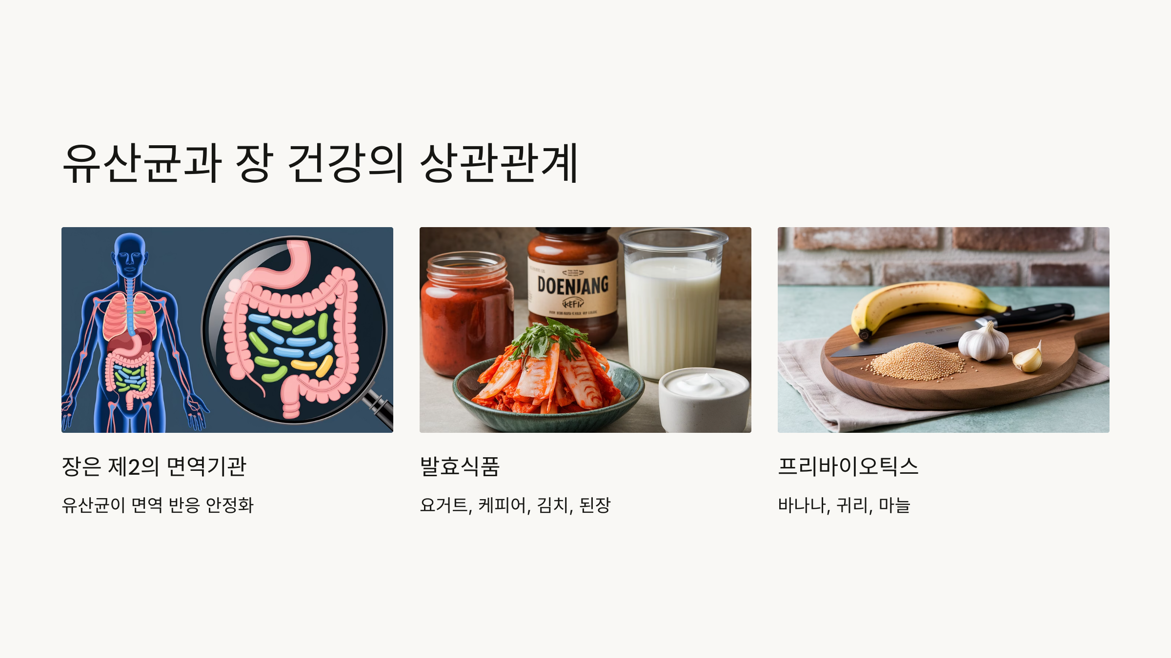 ‘장(腸)은 제2의 면역기관’이라는 말, 들어보셨나요? 유산균이 장내 환경을 개선해 면역 반응을 안정시켜주는 데 큰 역할을 해요. 특히 아래 식품들은 유산균 섭취에 매우 유용하죠.