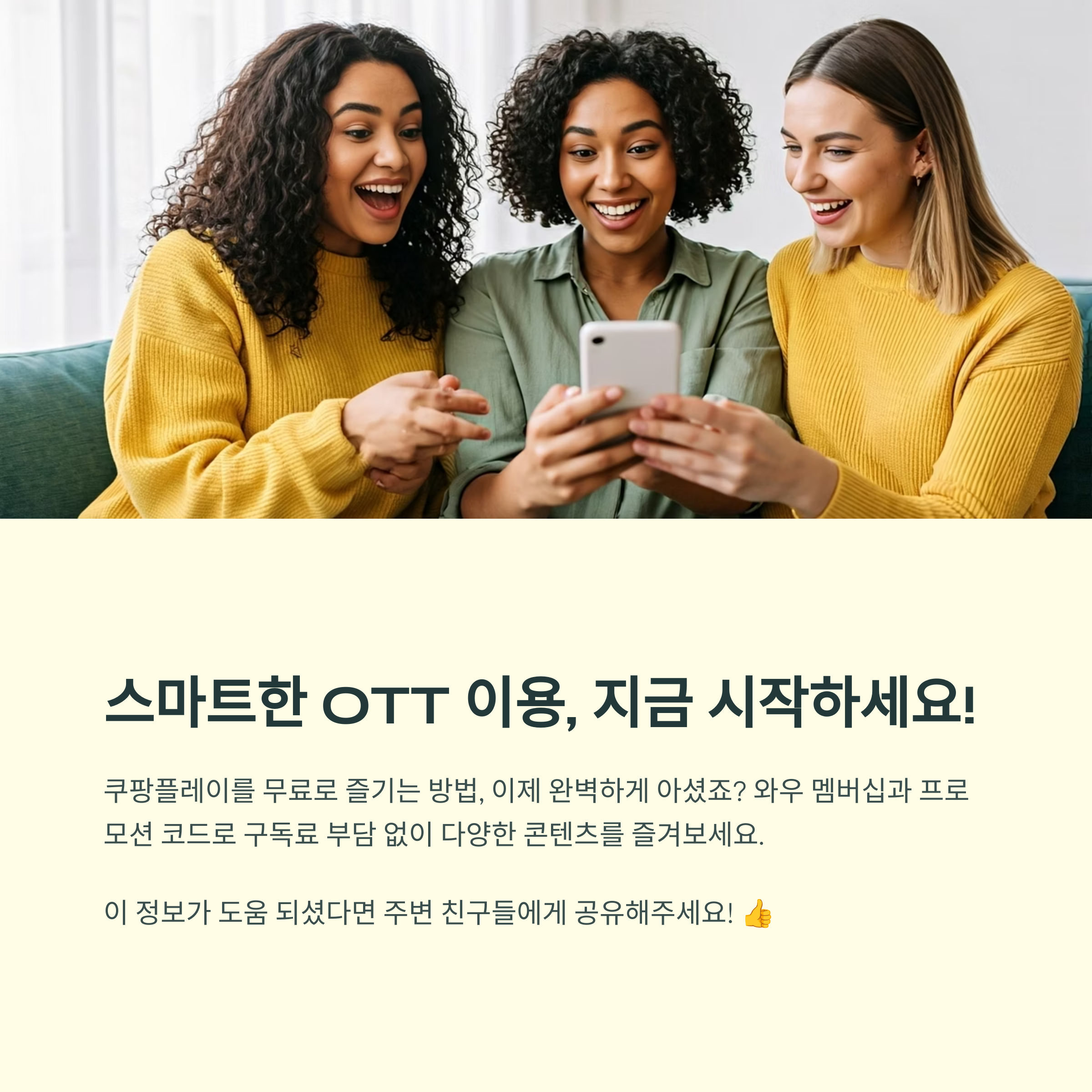 이제 쿠팡플레이를 무료로 보는 방법, 완벽하게 아셨죠? 구독료 부담 없이도 충분히 다양한 콘텐츠를 즐길 수 있는 팁들이에요. 저도 처음엔 반신반의했지만, 실제로 무료 체험으로 꽤 오래 즐겼고 지금은 와우 멤버십으로 꾸준히 활용 중이에요. 혹시라도 주변에 이런 정보 잘 모르는 친구나 가족이 있다면 꼭 공유해주세요. 여러분도 지혜롭게, 알뜰하게, 그리고 스마트하게 즐기시길 바라요!