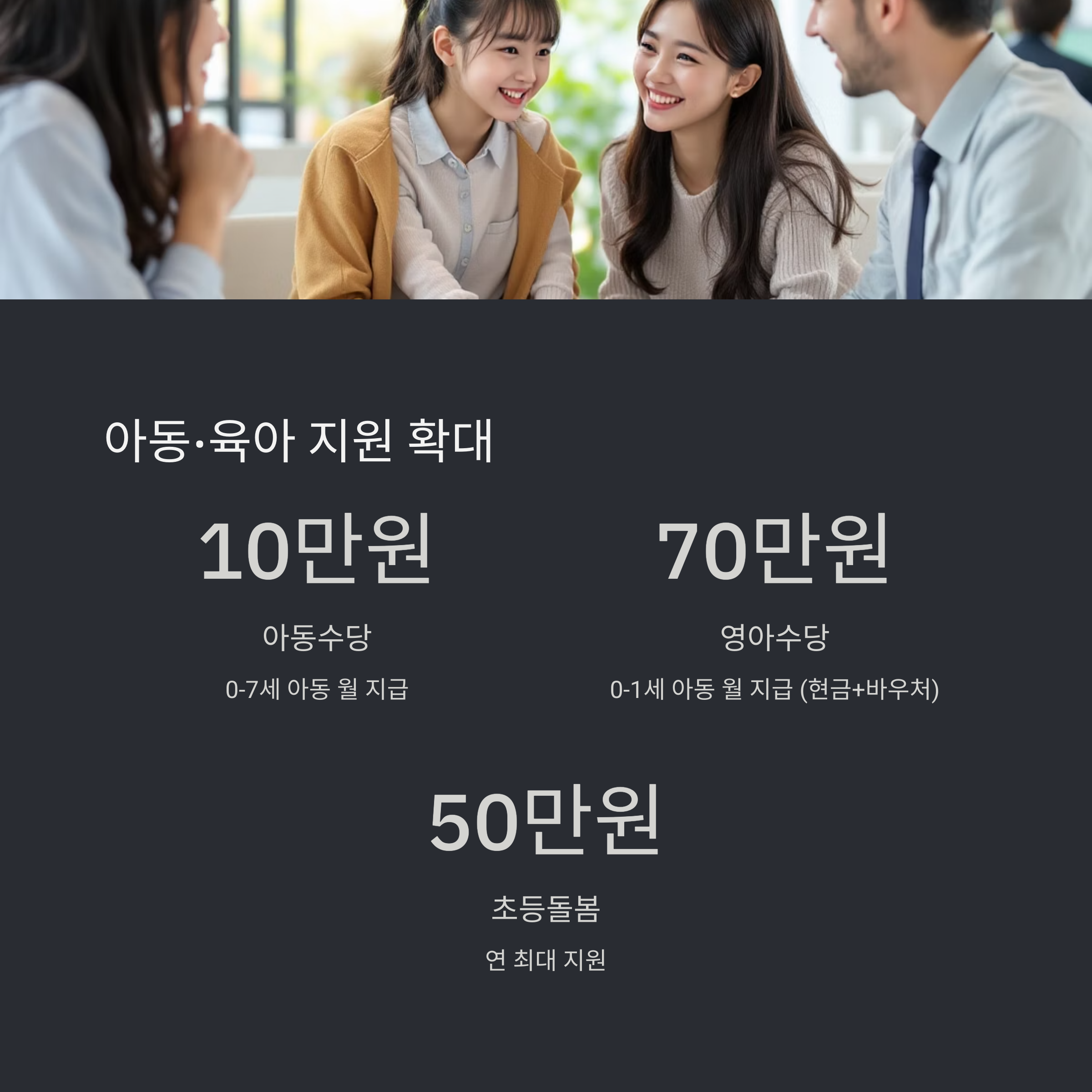 - 영아수당: 0~1세 아동 월 70만 원 (현금+바우처)