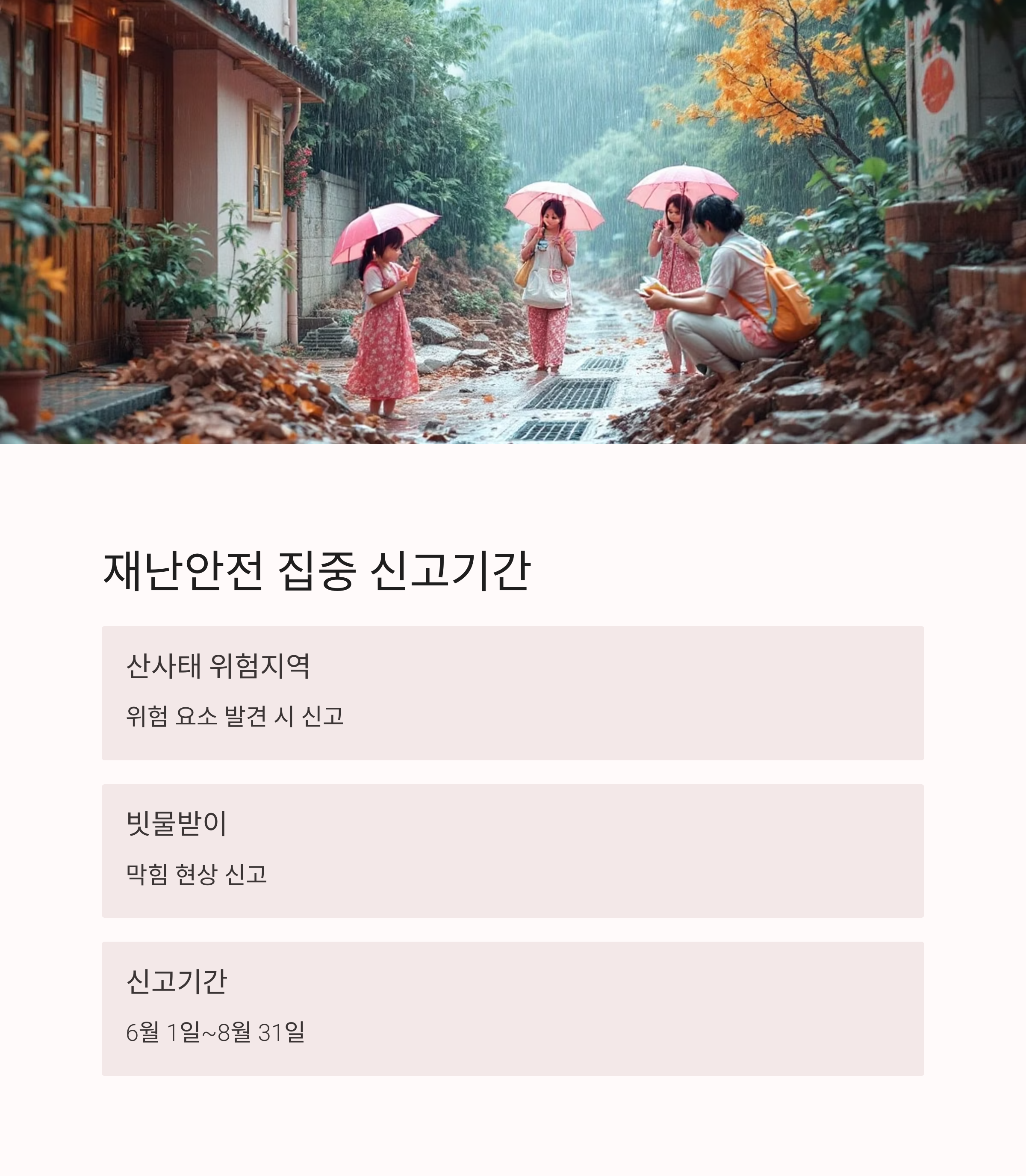 | 재난안전 | 여름철 산사태·빗물받이 등 위험요소 집중 신고기간 | 6.1~8.31 |