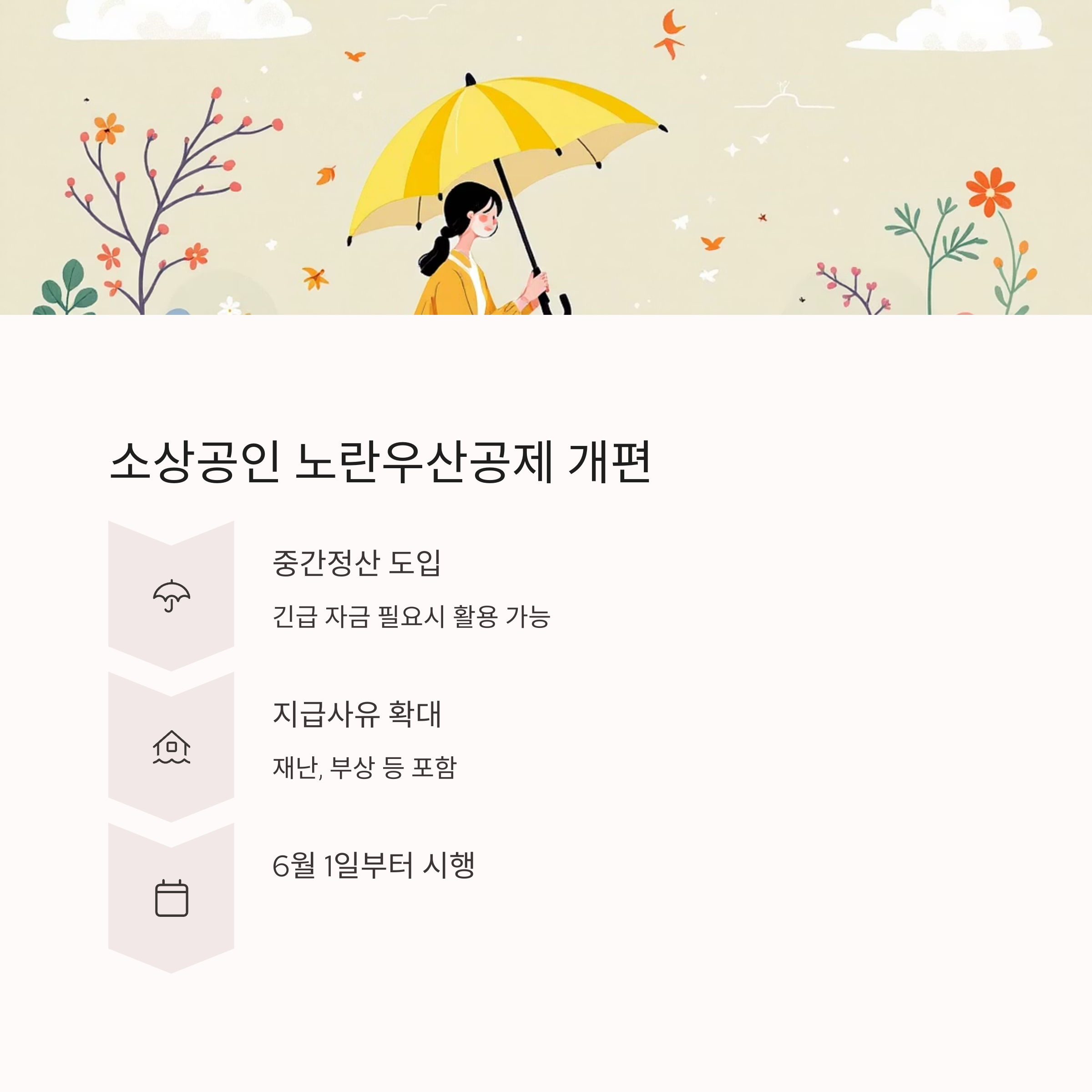 | 소상공인 | 노란우산공제 중간정산 도입 지급사유 확대 (재난·부상 포함) |