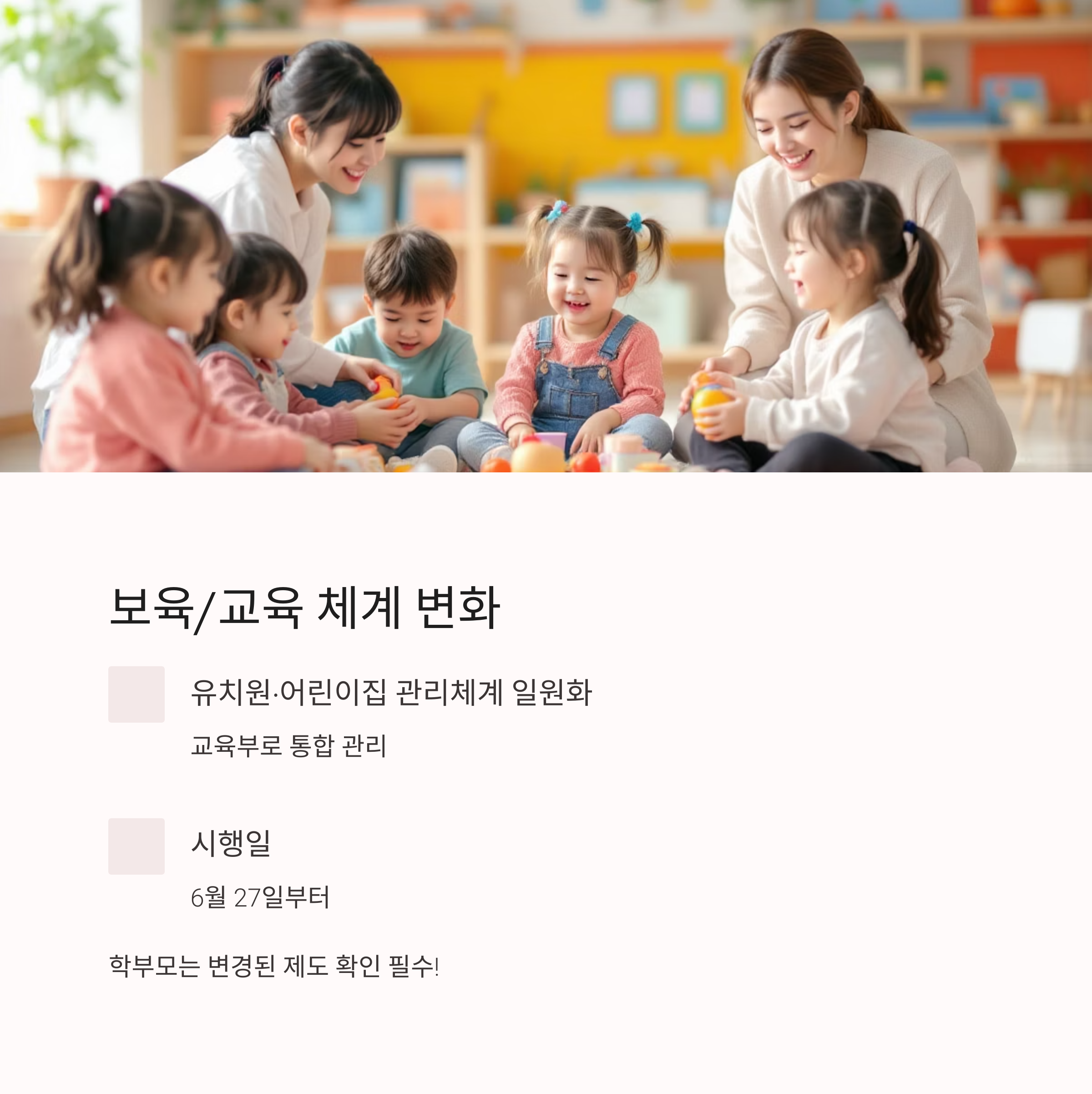| 보육/교육 | 유치원·어린이집 관리체계 일원화 (교육부 통합) | 6.27~ |