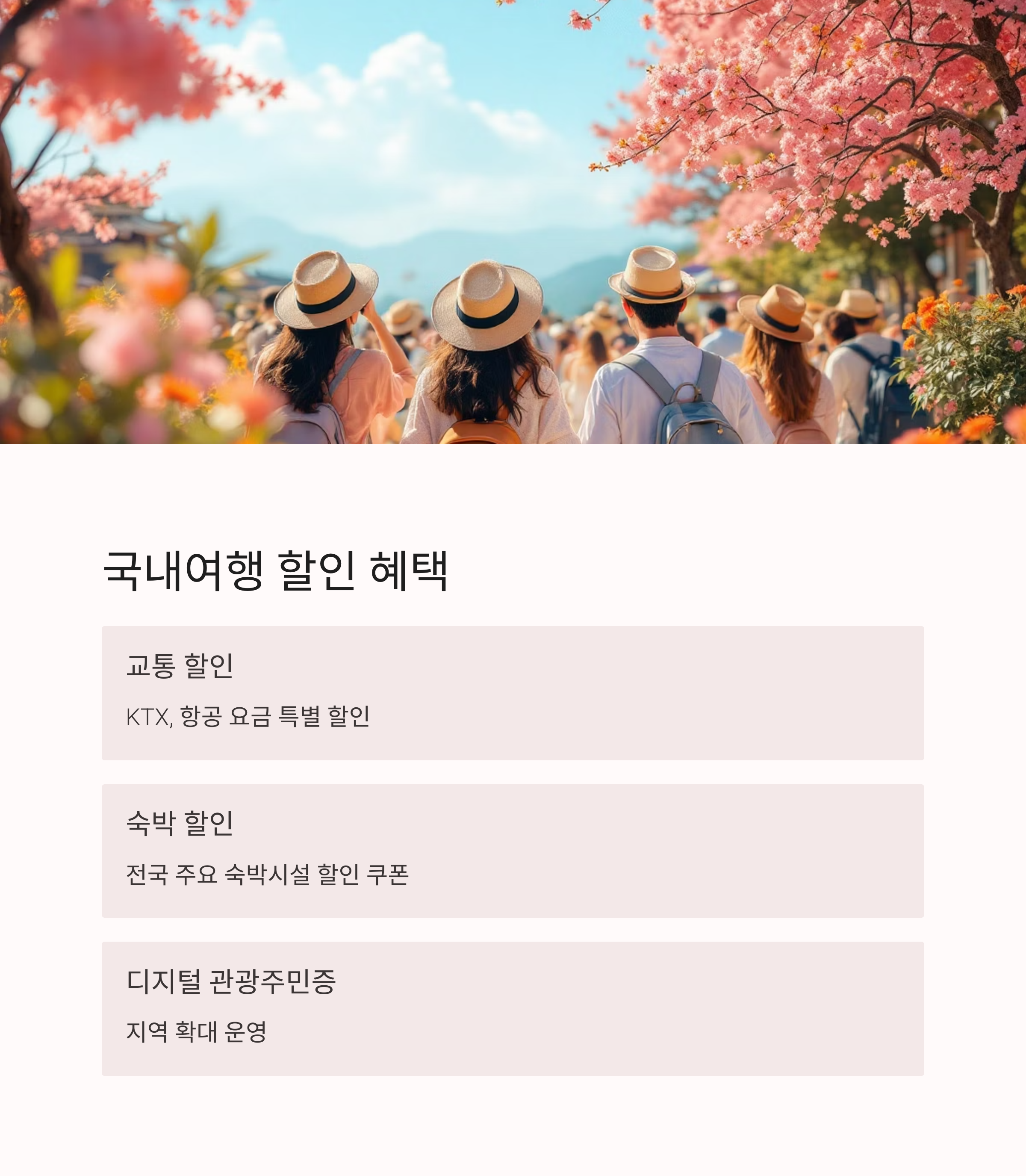 | 국내여행 | KTX·항공·숙박·관광지 할인 디지털 관광주민증 지역 확대 |