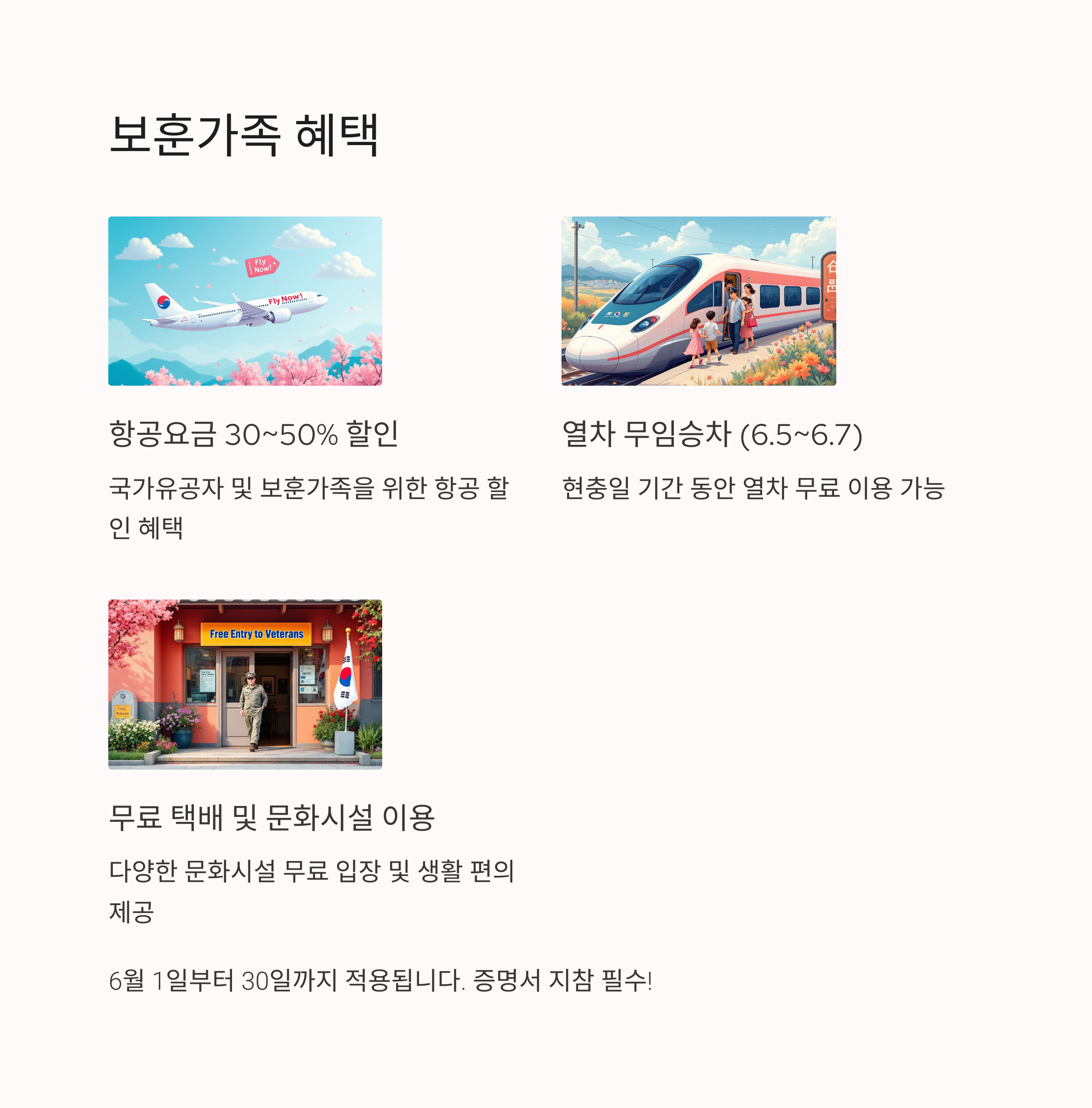| 보훈가족 | 항공료 30~50% 할인 열차 무임(6.5~7) 무료 택배·문화시설 |